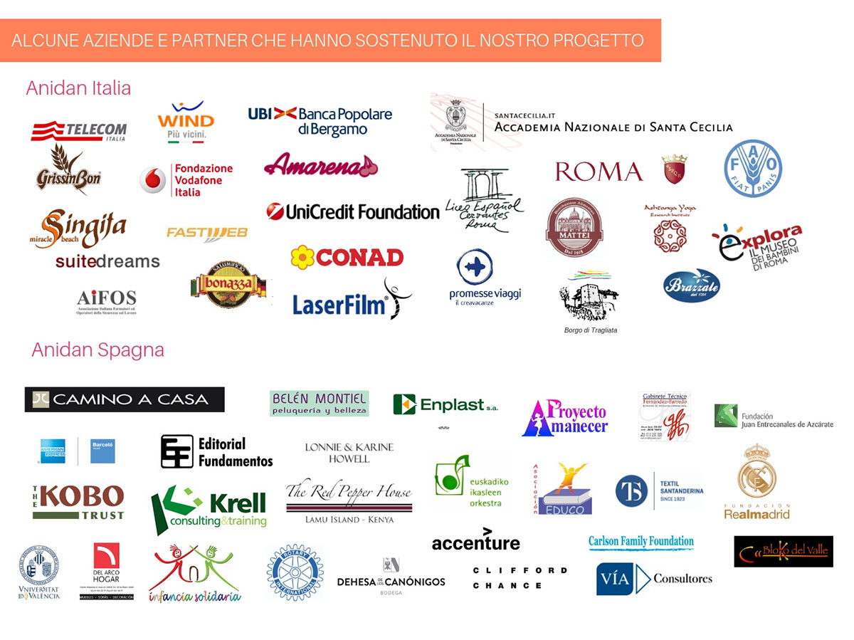 Anidan ha potuto contare sulla sensibilità e la fiducia di alcune aziende e partner che hanno saputo cogliere l’importanza e il valore del nostro progetto umanitario e contribuito (in occasione di eventi e campagne) per migliorare le condizioni dei bambini di Lamu. Siamo grati per la loro collaborazione e supporto, che sono stati fondamentali per il successo del nostro programma.